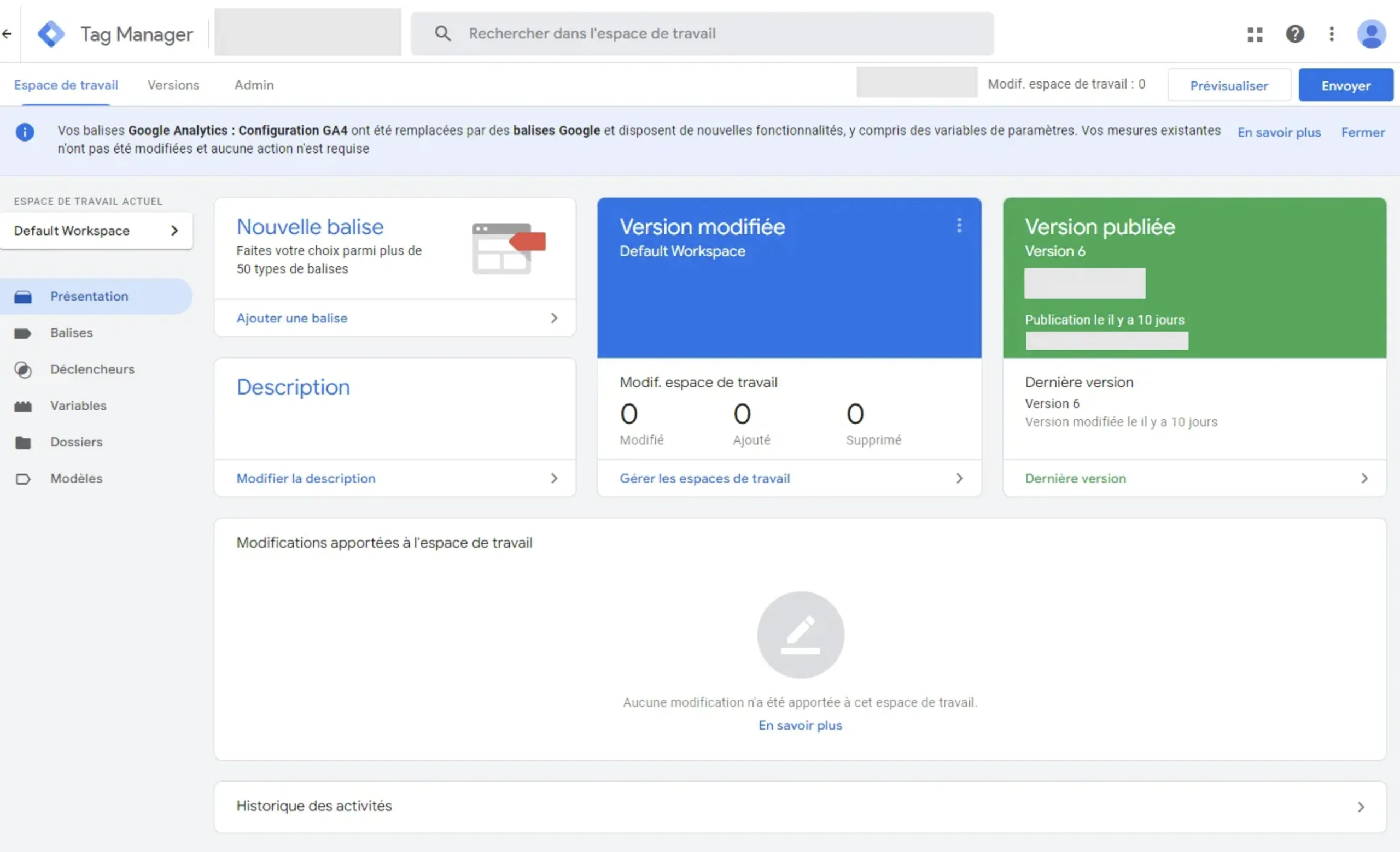 Publication du conteneur GTM Seulement après validation complète, on publie la version du conteneur avec un commentaire descriptif pour faciliter le suivi des versions.